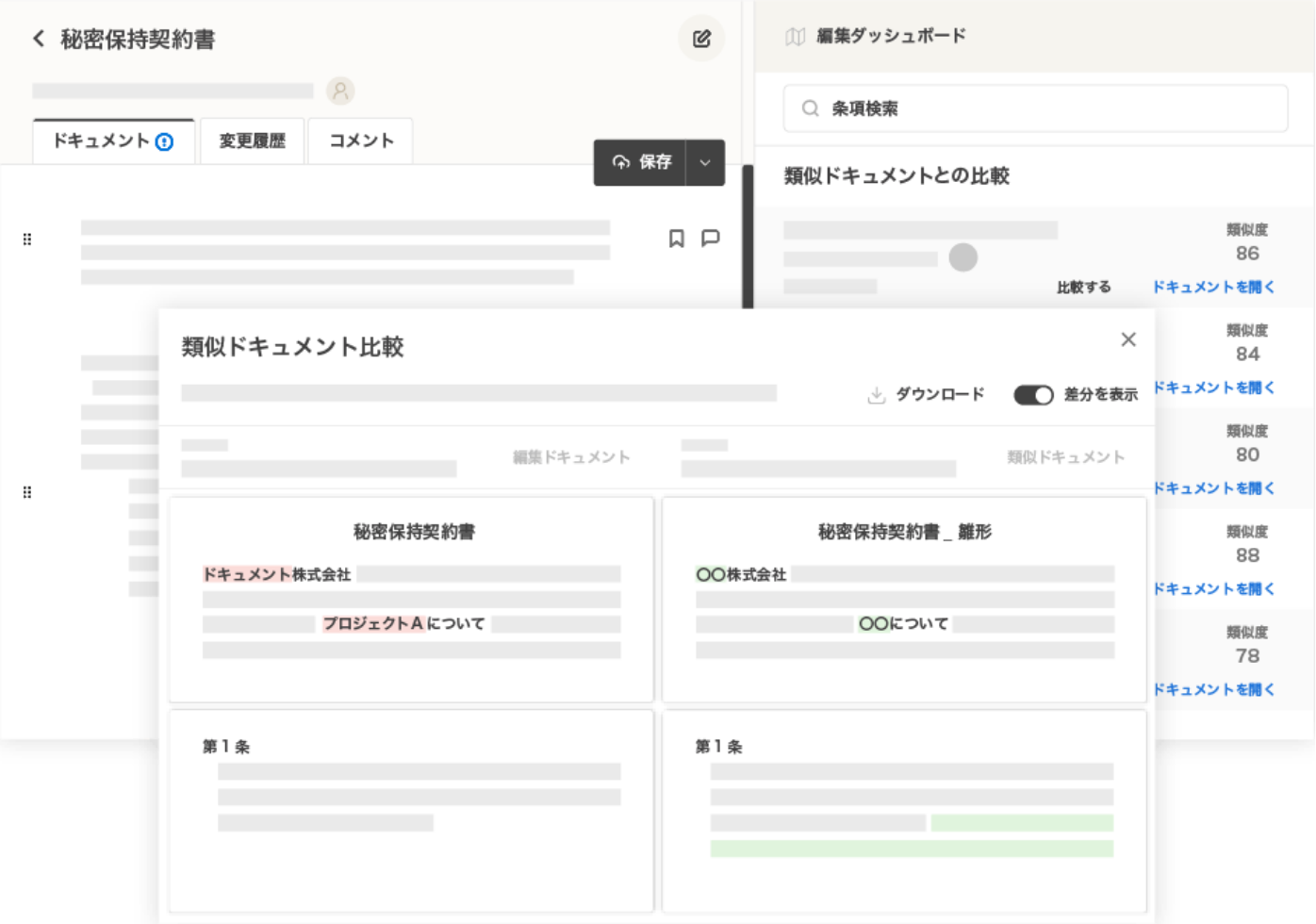 レビューの観点では、契約書の類型によらずに(かつ契約書以外の文書であっても)ご利用いただける点や、"自社の資産との比較による"リスク検知や欠落条項の自動検出が可能な点が異なります。