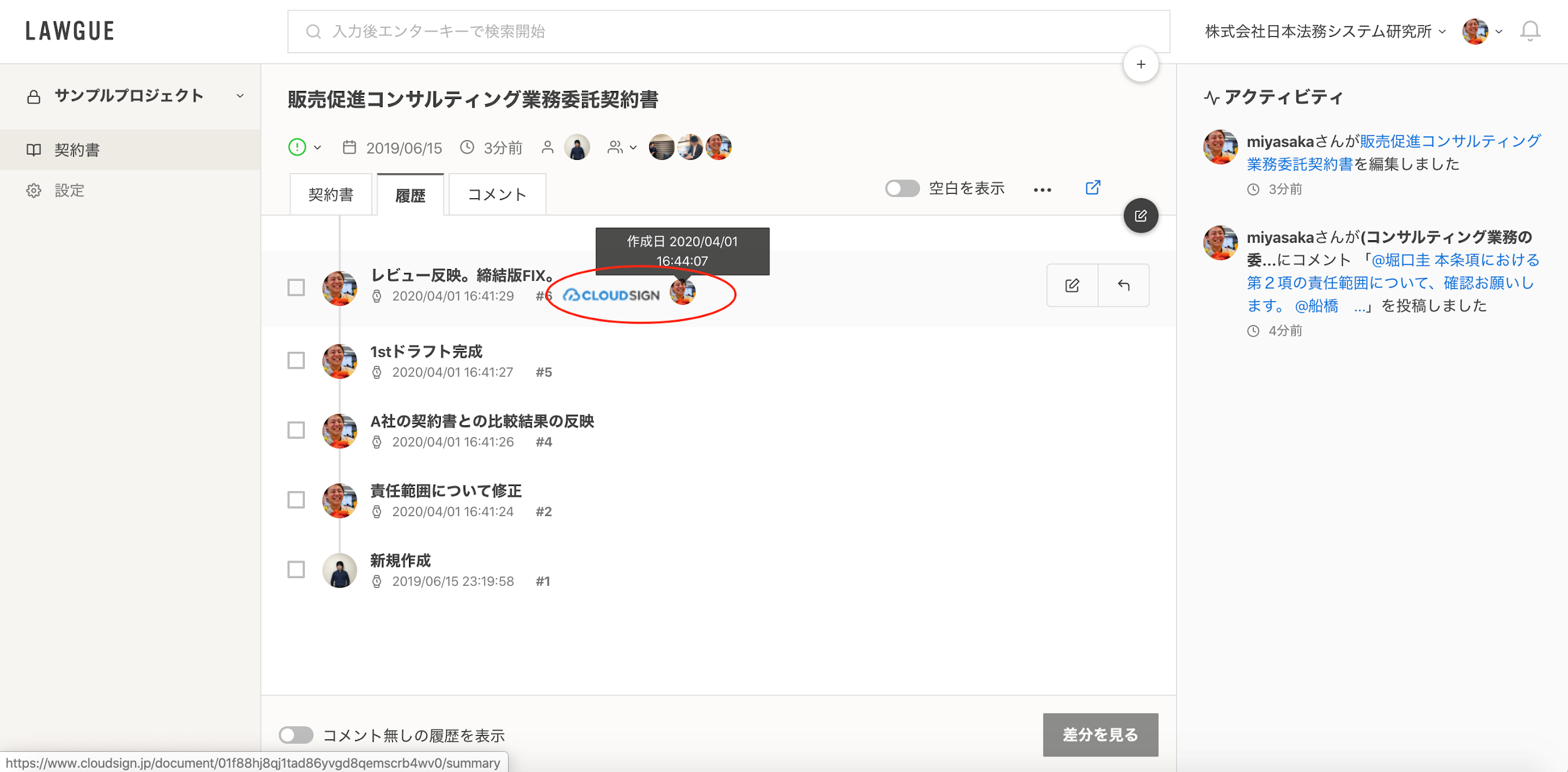 【「LAWGUE」画面:「クラウドサイン」への送信結果をバーション管理】