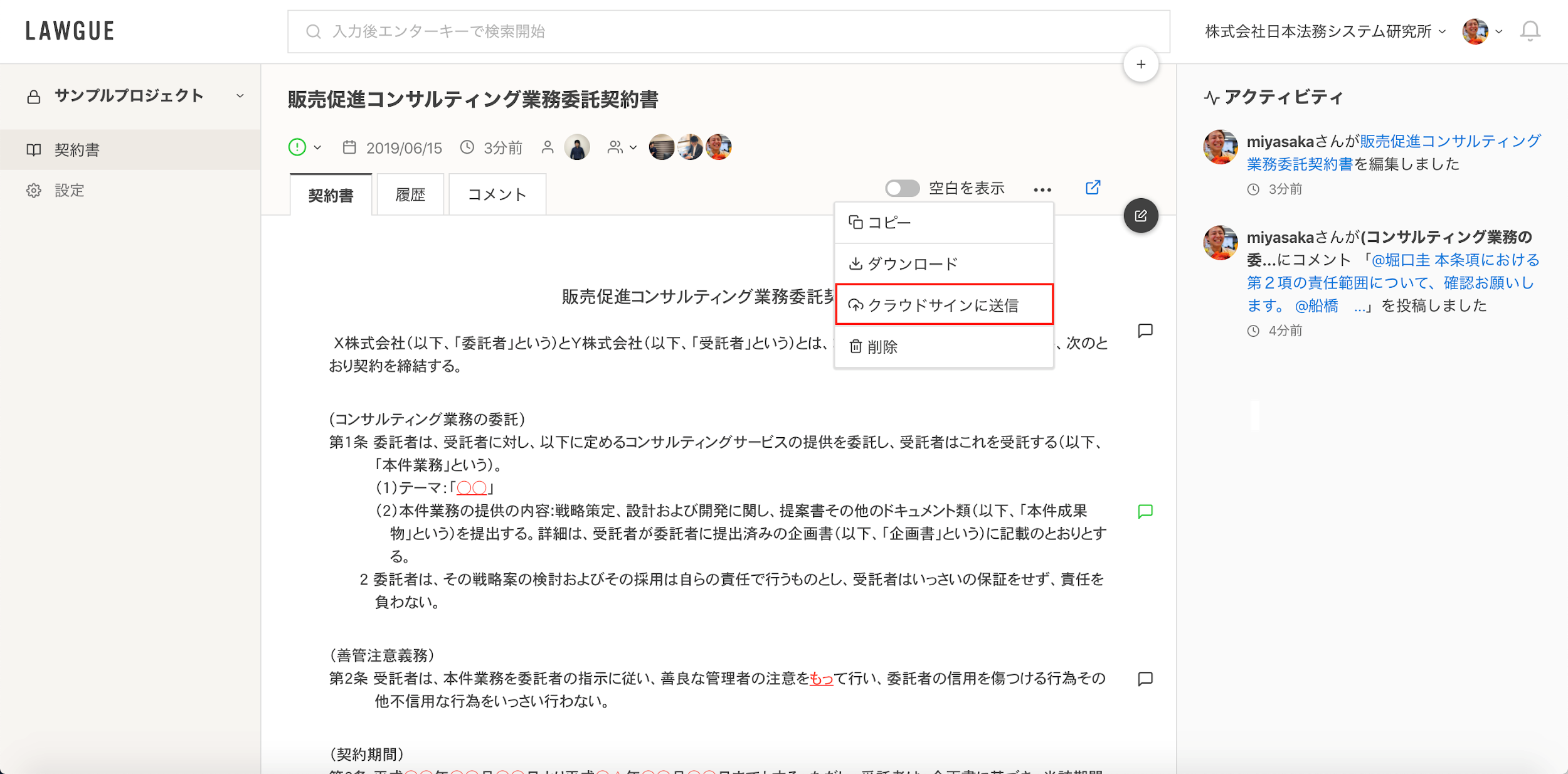 弁護士ドットコム株式会社が提供するWeb完結型クラウド契約サービス「クラウドサイン」とのシステム連携を開始しました。本連携により、「LAWGUE」上での契約書作成後に、「クラウドサイン」でのスムーズな電子契約の送付が可能になります。