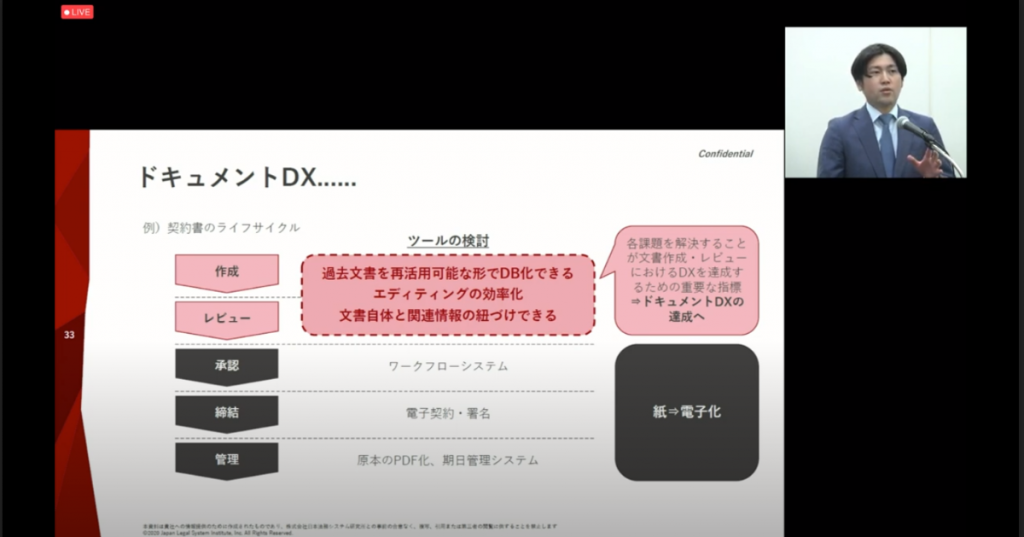 3月5日にオンラインで開催された日本経済新聞社主催「リーガルテック最新動向2021~DX推進で変革する企業の業務効率~」に弊社営業企画部長・山田が登壇いたしました。