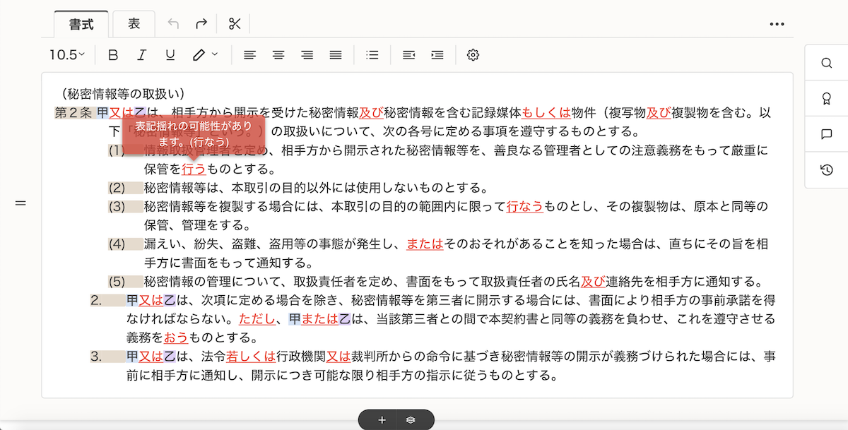 甲乙丙を色分け表示してくれる機能も、2者間契約を3者間に変更する際の修正漏れを見つけやすく、役立っています。
