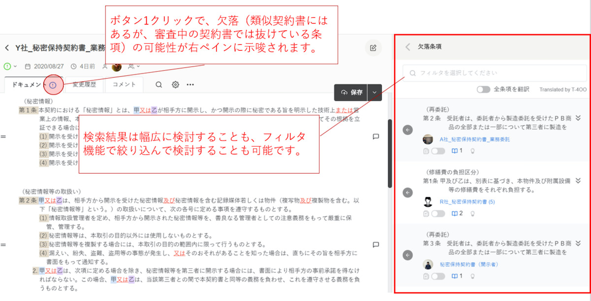 欠落条項サジェストと類似条項検索の活用で、契約書を「見比べる」「見直す」時間を短縮。工夫次第で英文契約書の内容把握スピードも向上。